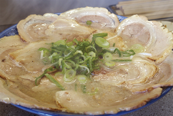 スープのベースは、とんこつ。メニューにはラーメンのほか、きくらげラーメン、メンマラーメン、ワンタンメンとあるが、江原さんのおススメはチャーシューメン(950円)。どうだといわんばかりに所狭しと並べられたチャーシュー。麺が見えない。仕上げに使うのは、バーナーだ。いわゆる炙りチャーシューである。香ばしい香りが食欲をそそる。