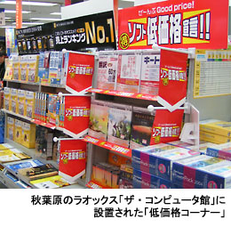 ■売り上げ減の歯止めになるか こうした背景にはまず、低価格コーナーを切り口にして、ハードウェアとソフトを融合させる売り場改革を本格化させ、「売り場が狭まり、売り上げが減る傾向を改善したい」(竹下悟・流通事業本部コンシューマ営業統括部CN企画営業課長)との思いがある。低価格コーナーはソフト売り場だけでなく、「携帯電話やDVD、デジタルカメラなど、好調な分野のハード売り場にも設置して、ハードとソフトを同時購入する需要を喚起する」(同)ことも考えている。