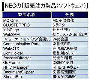 NEC(金杉明信社長)は、オフコン時代から、NECグループ内の営業部隊や系列販社などによるシステムインテグレーション(SI)を通じたソフトウェア販売(「プッシュ型」)に定評があった。ところが、「オープン系システムの時代に入り、外資系や国内のソフトベンダーとも競争することになった」(岡田高行・システムソフトウェア事業本部長)が、主力はプッシュ型のままであった。