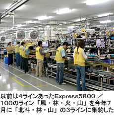 NECのスーパーコンピュータやサーバーなどを生産しているNECコンピュータテクノ(山梨県甲府市、那須賢治社長)の生産革新活動は、98年に始まり今年で7年目となる。デリバリ改革の開始は00年で、デリバリ改革発祥の地でもある。NECコンピュータテクノの生産革新の成果は、04年度は97年度比で「Expressサーバーの生産リードタイムが5分の1に、棚卸資産は60%減、生産性は4倍に向上」(那須社長)した。
