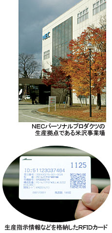NECグループのパソコン生産拠点であるNECパーソナルプロダクツ米沢事業場(山形県米沢市)で、このほどRFID(無線タグ)を使った生産管理システムの第2段階として「電子かんばん」の活用が始まった。これまで生産指示情報などをRFIDカードに格納し生産管理に利用してきたが、さらに一歩進めて部材の発注や納品管理にもRFIDを使うことにした。(編集委員川井直樹)