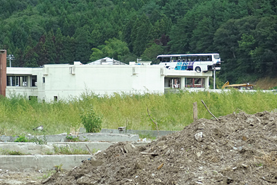 津波に押し流されて、公民館の屋上に打ち上げられたままの大型バス
