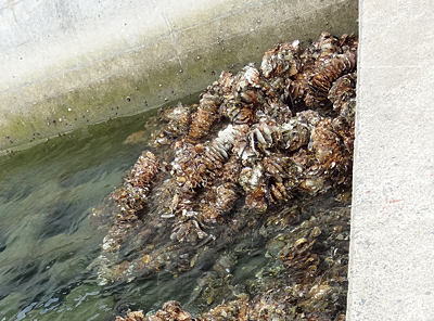 桟橋の波打ち際に息づくカキの稚貝