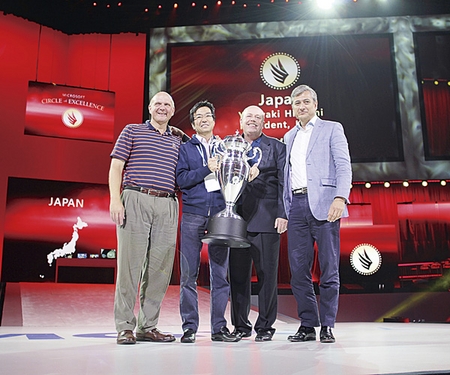 日本マイクロソフトは、昨年度、先進5か国のなかで一番の好業績をあげた子会社として米本社に表彰された。左から2番目が樋口社長。左は米マイクロソフトのスティーブ・バルマーCEO(写真提供:日本マイクロソフト)WindowsとOfficeは特別な存在