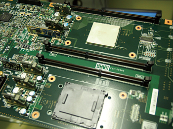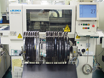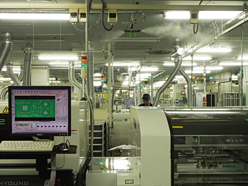 基盤製品は、主に五つの工程を踏む。(1)基盤に部品を実装するための「はんだペースト」の印刷、(2)部品の搭載、(3)「リフロー」というはんだづけと「プレスフィット」と呼ばれる特殊機を用いた部品の固定、(4)検査、(5)パッケージというように進む。この工程で基盤に実装される部品は、約3000点(ハイエンド機種)にもおよぶ。