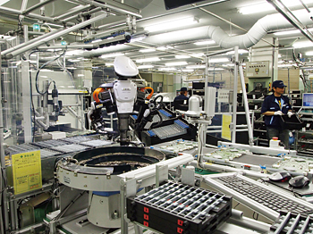 装置の組み立て工程では、熟練技術者とロボットが協力する。まず各組み立て部門に適切な部品を運ぶ役割を果たしているのは、人ではなくロボット。ICカードが埋め込まれた部品格納箱に部品がなくなると、倉庫にその情報が伝わって、部品配送ロボットが起動。適した場所に運ぶ。部品配送ロボットには、人や壁、モノを検知するセンサが組み込まれていて、障害物や人がいる場合は停止するので、事故は起こらない。