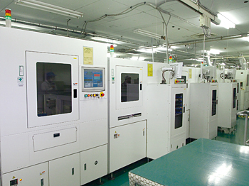 リフローという方式ではんだづけ。真空状態にするために大型の筒状の装置の中ではんだづけする