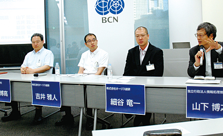 パネルディスカッションでは、講演者の山下氏と吉井氏に加え、理想科学工業 開発本部 P&Dセンター SA開発部 次長の金田博高氏(左)、オージス総研 サービス事業本部 グローバルプロダクト部部長の細谷竜一氏(右から二番目)が参加した開発プロジェクトにおける“成功”の定義が変わった