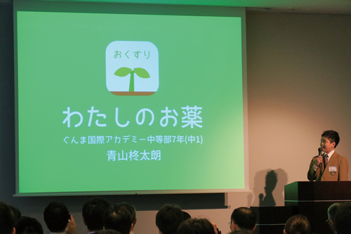 経済産業大臣賞プロダクトは、ぐんま国際アカデミー中等部7年生(中学1年)の青山柊太朗さんのアプリ『わたしのお薬』。夏休みに米シリコンバレーのプログラミング講座「Make School」に3週間通い、英語で行われる授業を受けて、プログラミングの基礎を学んだという。