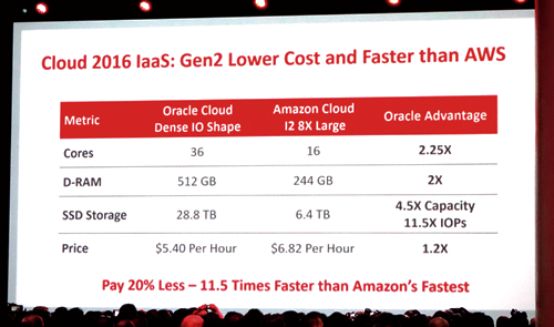 米オラクルが発表したIaaS戦略はOOW 2016のメイントピックとなったが、IaaSそのものは同社にとってまったく新しいサービスというわけではない。昨年のOOW 2015でも、基調講演でエリソン会長自ら、「物理サーバー専有型のIaaSをAWSのサーバー共用型サービスの半額、アーカイブストレージをAWSの10分の1の価格で提供する」と(今回ほど大々的にAWSへの対抗色は出してはいなかったが)発表している。ただし、日本では国内DC稼働の計画が今夏まで明確にされなかったことも影響しているのか、正式なローンチには至っていなかった。