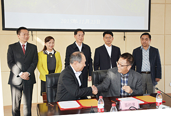 貴陽で人材育成の取り組みに調印するユーキャンチャイナの坂西健二董事長 また、花渓大学城の学生の起業支援を目的とした「貴安創客連盟」も15年6月に設立されている。起業家に求められる能力の研修やマーケティング支援、無料のスタジオオフィス、投資・融資機構や資本家との商談機会などが提供される。貴安創客連盟の王克総武秘書長は、「3年間で1万の革新的な創業プロジェクトを育成し、10万の創業者を支援したい」と野心的な目標を掲げている。