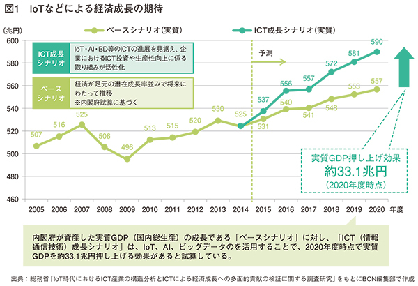総務省の「IoT時代におけるICT産業の構造分析とICTによる経済成長への多面的貢献の検証に関する調査研究」(図1)によれば、IoTや人工知能(AI)などの投資拡大で実質GDP(国内総生産)のベースシナリオに比べ、2020年度で約33.1兆円を押し上げると予測。日本経済の成長に向けてIoTなどの提供拡大は、待ったなしの状況にあり、SIerの責務も増している。
