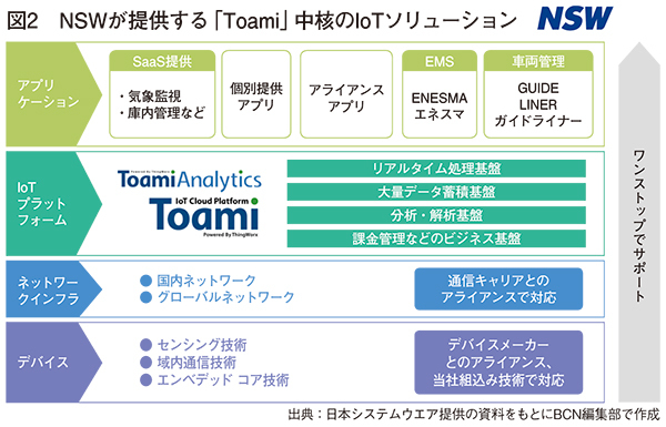 そのため、13年5月には、米ThingWorx(現PTC)のクラウド型IoT基盤をローカライズし、自社のM2M/IoTクラウドプラットフォーム「Toami(トアミ)」(図2)をリリースした。Toamiは、通信機器などのIoTゲートウェイやコントローラに同基盤専用アプリを組み込むことで、IoTクラウドとのセキュアな双方向通信が実装できるほか、イベント駆動型の処理エンジンでリアルタイム処理が可能。本番稼働後の顧客との関係性強化や収益モデルを築く重要な基盤となり、IoT事業が急成長している。