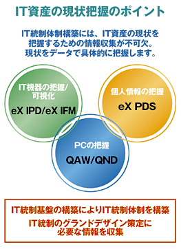 クオリティは、IT統制基盤の確立に欠かせないIT資産管理ツール「QAW/QND」といったソリューションや、IT資産接続監視ツール「eX IPD」、IT資産可視化ツール「eX IFM」、個人情報ファイル探査ツール「eX PDS」などを用意している。これらのソリューションを組み合わせて利用し、レポーティングツール「eX Report」でITリスクへの評価をおこなうことにより、社内の現状を正しく把握することができる。