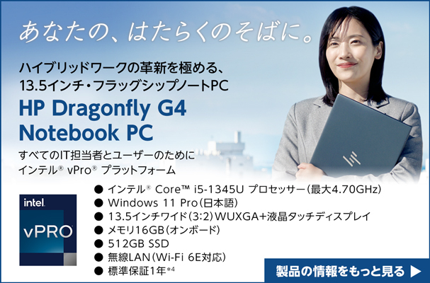現在、日本HPでは「あなたの、はたらくのそばに。」をキーワードに、中堅・中小企業を支え、寄り添うPCとして「HP Dragonfly G4」のキャンペーンを展開している。「HP Dragonfly G4」は上記のようなサステナブルなビジネスモバイルPCの1台。B5ノートと同じくらいのサイズで、重さは約1.0kg*3と軽量かつコンパクトに仕上げられ、スピーカーのエンクロージャ部品にオーシャンバウンド・プラスチックを使用する環境配慮型PCだ。搭載するCPUは「第13世代インテル® CoreTM プロセッサー・ファミリー」。前世代から採用されている多コア多スレッド化によるハイブリッドアーキテクチャをブラッシュアップし、圧倒的なパフォーマンスを発揮する。