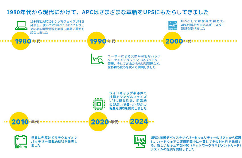 1984年、APCは初めてシングルフェイズのUPSを発売した。以降も同社はITインフラ業界で革新を起こし続け、シュナイダーエレクトリックグループに加わった後も同名のブランドとして展開されている。