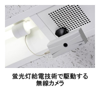 蛍光灯給電技術は、既設の蛍光灯にリング状の電力取得部を取り付けるだけで電力供給ができる。さらに、蛍光灯から取得できる電力に応じて映像の撮影頻度を自動制御する機能を新たに開発。市販のインバータ用直管型蛍光灯すべてで、無線カメラの消費電力を手動調整せずに最良画質で撮影・伝送できる。また映像伝送は無線化することで、ネットワークカメラ導入時の設置工事が不要となった。