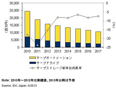IDC Japanは、国内テープストレージの2012~17年の年間平均成長率(CAGR)をマイナス7.7%と予測。2013年以降も、ディスクベースバックアップの影響を受けて引き続き減少すると分析している。(佐相彰彦)