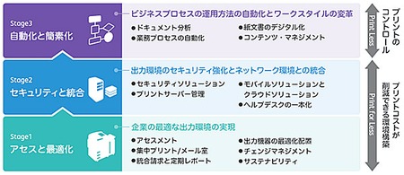 「セキュリティと統合」では、出力環境を最適化した後、オフィス、プリントルーム、モバイル、クラウドといった環境下で、ユーザー認証などのセキュリティ強化と出力の管理を行う。また、既存のユーザー認証システムや他社製の出力機器とも統合して、ユーザーごとにカラー出力枚数の制限を設けたり、機密書類の出力を制限するなどの個別設定をしたりする。