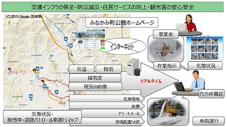 みなかみ町は、新システムを活用することで、降雨・降雪などの気象データとともに、道路パトロール車や除雪車の運行状況をリアルタイムに把握することができ、タイムリーで効率的な防災減災・雪害対策など、住民サービスの向上を図っている。