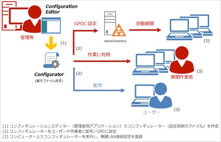 最大32プロファイルまで登録可能なコンフィギュレーターは、パスフレーズを含む各種接続設定情報を暗号化して、安全に内包するため、エンドユーザーはパスフレーズを意識することなく、クライアントコンピュータにワンクリックで無線LAN接続設定を展開することができる。また、管理者は、Microsoft Active Directoryを利用することで、無線LAN接続設定をクライアントコンピュータに自動展開することもできる。