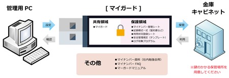 マイガードは、マイナンバーをクラウド上や企業内のネットワーク上において管理するのではなく、パソコン用のUSBメモリ内に保護領域を設けて、パスワードによって安全に保護管理する。マイナンバーを格納したUSBメモリは、パソコンから取り外し、企業内の金庫や鍵のついたキャビネットなどで保管するため、万一、企業内のネットワークが外部から不正にアクセスされた場合でも、安全に保護することができる。