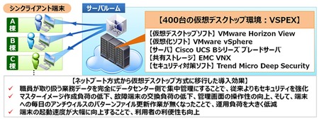 仮想デスクトップの作成方法では、リンククローン(マスターイメージを用意し、そのクローンを複数の利用者に展開する方法)を採用して運用負荷を低減するとともに、必要なストレージリソースも削減することでコストも抑制した。また、セキュリティ対策ソフトに「Trend Micro Deep Security」を採用することで、ウイルス対策ソフトのパターンファイル更新をサーバー側で実施し、従来は毎日必要だった端末への更新作業をなくすとともに、ウイルス検索時のシステムへの過負荷発生も回避している。