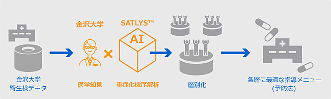 共同研究では、金沢大学が持つ長期経過観察を伴い腎生検で診断した糖尿病性腎症例の臨床・病理情報を用いて、金沢大学の医学的な知見と東芝デジタルソリューションズのアナリティクスAI「SATLYS」を活用することで、糖尿病性腎症の重症化メカニズムの解明を目指す。