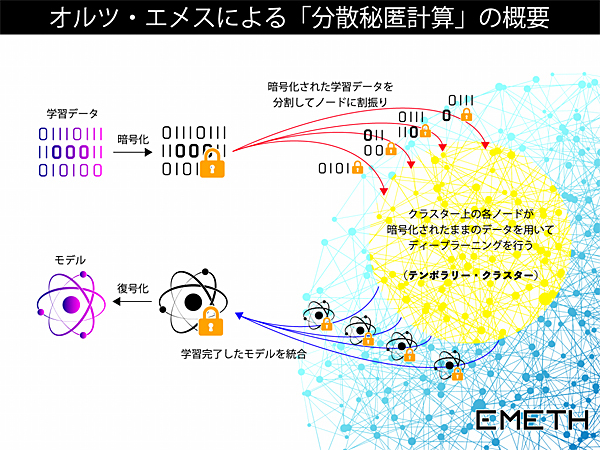学習処理のジョブがalt Emethに投入される際、その学習データを秘匿写像の方式で暗号化する。その後、alt Emeth上で繋がっている膨大な数のGPUノードから最適なノードが選定され、自動的にクラスターを形成。このクラスターを形成する各ノードが、自身に割り当てられた分の暗号化されたデータを取得しに行き、それぞれが学習を行った上で、結果をマスターノードに集約する。