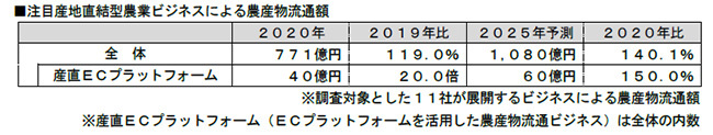 特に、ECを活用し、生産者から消費者など農産物を直接配送する産直ECプラットフォームの伸びが注目される。プラットフォーマーであるビビッドガーデンやポケットマルシェなどが個人消費者向けのサービスを充実させたことで、20年の流通額は前年の20倍にあたる40億円となった。