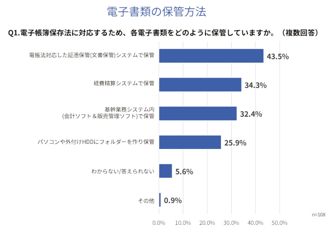 「電子帳簿保存法に対応するため、各電子書類をどのように保管しているか」と質問したところ、「電帳法対応した証憑保管(文書保管)システムで保管」が43.5%、「経費精算システムで保管」が34.3%、「基幹業務システム内(会計ソフト&販売管理ソフト)で保管」が32.4%だった。