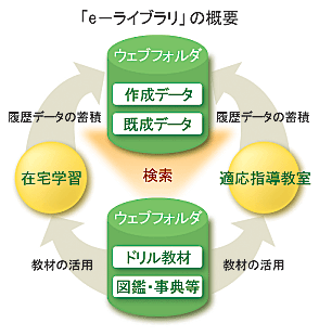 e-ライブラリでは、教材のデータベースと生徒の個人学習データがサーバーに蓄積され、教材を各生徒の理解に応じて自動的に準備する仕組みになっている。指導者は、生徒の学習進捗状況や成績結果をウェブ上で管理することができる。