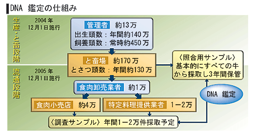 来月からは、いよいよ流通段階でのトレーサビリティ制度がスタートする。12月以降にとさつされる国産牛の枝肉や部分肉などには個体識別番号を表示。これを仕入れた食肉小売店や特定料理提供事業者は、個体識別番号を含む仕入れの記録を帳簿に記入して1年ごとにまとめ、2年間保存し、販売時には個体識別番号などを表示する必要がある。さらに牛肉と牛の個体識別番号との整合性を確保するためにDNA鑑定を実施する仕組みも新たに導入する。