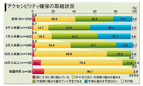 IT業界ではすでに広く認識が進み、対応している企業も多いと思われるが、05年3月に総務省が地方公共団体を対象に行った調査では、ウェブアクセシビリティの必要性について「首長を筆頭に一般職員も必要性を認識している」のは全体の1.8%。「必要性はほとんど認識されていない」は2割に達した。このため実際の取り組み状況も表に示すように「すでに十分に取り組んでいる」とする団体はわずか2.6%にとどまっている。