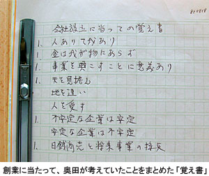 ともあれ、久田仁氏、小林一作氏などに学んだことは、起業に当たって大きな財産となった。写真は1981年8月18日付の「会社設立に当っての覚え書」で、最初に「人ありて我あり」をもってきている。「人から学ぼうとする姿勢」は創業時からのものだったことが分かる。