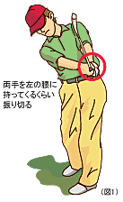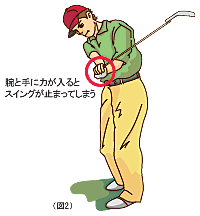 その時の振り抜き方向ですが、両手が左腰のところに行くくらい左方向に振りぬきましょう(図1)。グリップに力が入ると両腕が伸びてしまい、スイングを止めてしまう形になります。また脇が開いてしまうので、球筋が安定しません(図2)。