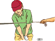 図3のようにゴルフクラブのシャフトを使って正しいアドレスのチェックをしてみましょう。左腕がやや伸びていて、右腕が曲がった状態、そして、体重はやや右足側にかけた姿勢でバックスイングをあげるようにトライしてみて下さい。