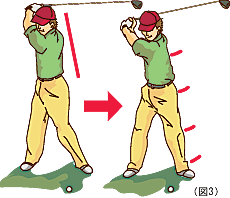 図2のような正しいバックスイングができたら、ダウンスイングを左サイドからスタートさせる、もしくは体重を左足に移すようにイメージしましょう。左肩、左腰、左ひざ、左足首それぞれを切り返して戻すようにすると、シャフトのしなりを使うことができ、インパクトで軽く腕が振れて、ヘッドが走るスイングが可能です(図3)。