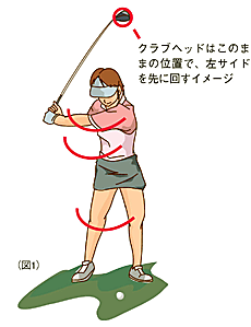 バックスイングから一番最初に始動する部分は左サイド、つまり左肩、左腰、左ひざから回転させていくイメージを持ちましょう(図1)。もしくは、バックスイングのトップから、おへそを目標に向ける、とイメージするのもいいかもしれません。