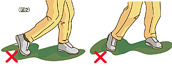 スムーズな体重移動と回転をするためには、フィニッシュで右足の踵(かかと)が完全に上がっていなければいけません。フィニッシュで自分のスイングをチェックしてみてください。練習場でもよく右足が上がっていないプレーヤーを見かけます(図2)。