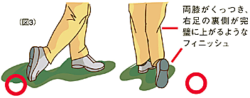 右足の踵が上がっていないというのは、体重移動ができてない証拠です。必ず、右足の踵が完全に上がっていて、右ひざと左ひざがくっつくような(図3)フィニッシュを心掛けて下さい。