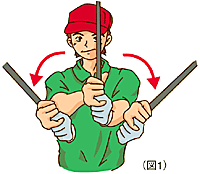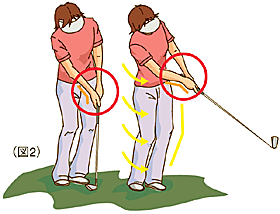 いくら小さいスイングだからと言って、手や腕だけでボールを上げようとすると、必ずミスショットにつながります。必ず、右脇、右肘の右サイド全体を回して、右手の形を崩さずに振りぬきましょう(図2)。