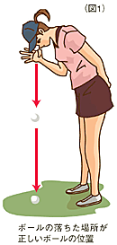 一般的に、ボールの位置は目の真下がいいと言われています。その位置がパッティングのラインが見やすく、また、アドレスが安定するようです。図1のように、自分のボールの位置をチェックして下さい。そうすることによって、安定したアドレスから、あまり手首を使わないパッティングが可能になります。