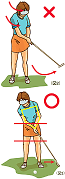 肩に力が入っていると、肩で腕を止めてしまうので、手が左右に動かなくなり、その結果手首だけが返ってしまい左にひっかけてしまいます。アドレスをしたら、軽く息を吐き、肩を下ろすように力を抜いてみてください。