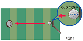【1】ボールのセッティング グリーン上で自分のボールをリプレースする際に、ボールのブランドネームを自分の打ちたい方向に合わせてみましょう(図1)。この行為は決してルール違反ではありませんので、やらなきゃ損です!