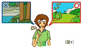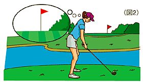 そこで、ネガティブ思考になりそうになったら、自分の意識を他のことに向けるといいでしょう。「空が青い」、「鳥がかわいい」、「ティーグランドの花がきれい」、「緑が目に気持ちがいい」など、ゴルフと全く違うことを考えてみましょう(図1)。ネガティブ思考を拡大させないことが可能になります。