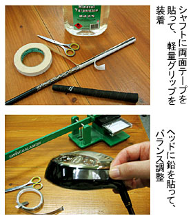 クラブの調整や改造は、専門のお店に行けばすぐに対応してくれます。また、ご自分で調整してみたいと思われる人は、カッターかハサミ、両面テープ、グリップ交換用液、バランス鉛を用意してください。割と簡単にできますから、やってみたらいかがでしょうか。ただ、カッターなどを使うのでケガには十分注意してください。