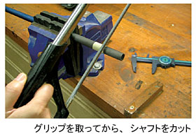 さて、45インチのドライバーなら思い切って1.5インチ短くして、43.5インチにします。すると、バランスがだいたい4-5ポイントくらい軽くなってしまいますから、まずグリップはオリジナルよりも軽量のタイプに変更。それからヘッドにバランス用の鉛を貼って最終調整します(ヘッドの鉛は球筋にも影響します。これについては次回に説明します)。