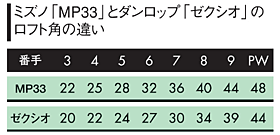 近年のヒットモデル、ミズノ「MP33」とダンロップ「XXIO(ゼクシオ)」について、アイアンのロフト角の違いを見てみましょう。ゼクシオの方がだいたい一番手分立っているのがお分かりでしょう。