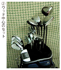 一方、写真②は年齢58歳、ハンデ14のいわゆるアベレージゴルファーの例。ウッドがドライバー、3番、5番、7番、9番、そして22度のユーティリティ。アイアンが5番からSW。パターを入れて14本ですが、このセットには落ちた飛距離をおぎなう苦心があらわれています。